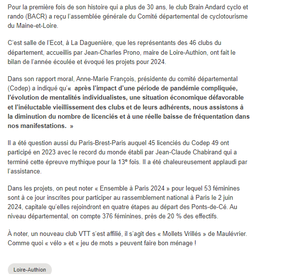 Merci à tous les Cyclos du Lys qui ont su si bien nous recevoir , aux bénévoles ( ils se reconnaîtrons) qui ont œuvré pour que cette soirée se passe bien et à tous ceux qui ont boudé la soirée , on leur dit à bientôt le Samedi 25 01 2025 à St Georges sur Loire où Xavier Doineau et son club vous attendent à 12 h pour une nouvelle organisation festive .